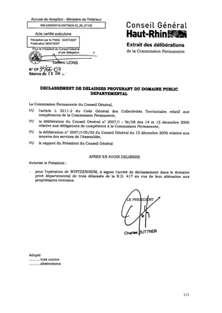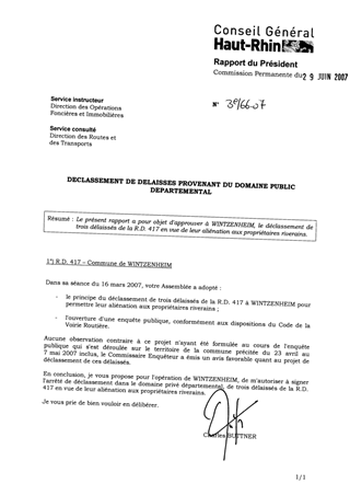 Le présent rapport a pour objet d'approuver à WINTZENHEIM, le déclassement de trois délaissés de la R.D. 417 en vue de leur aliénation aux propriétaires riverains.