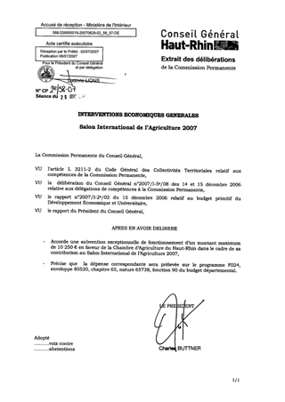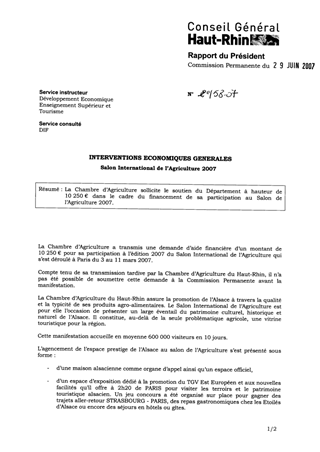 La Chambre d’Agriculture sollicite le soutien du Département à hauteur de 10 250 € dans le cadre du financement de sa participation au Salon de l’Agriculture 2007.