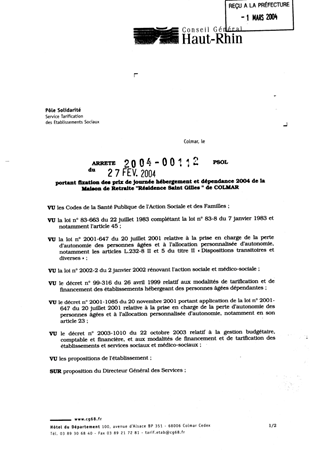 portant fixation des prix de journée hébergement et dépendance 2004 de la maison de retraite "Résidence Saint Gilles" de Colmar. Resumé Pièces jointes ARRETE Assemblée : Non défini Date : 27/02/2004 Rapporteur : Non défini Collectivité : Conseil départemental du Haut-Rhin Direction : Non défini Service : Service de la Tarification des Etablissements Domaine : Prix de Journée Commission :