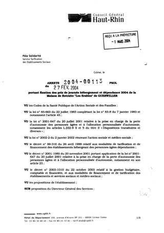 portant fixation des prix de journée hébergement et dépendance 2004 de la maison de retraite "Les Erables" de Guebwiller. Resumé Pièces jointes ARRETE Assemblée : Non défini Date : 27/02/2004 Rapporteur : Non défini Collectivité : Conseil départemental du Haut-Rhin Direction : Non défini Service : Service de la Tarification des Etablissements Domaine : Prix de Journée Commission :