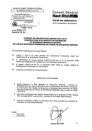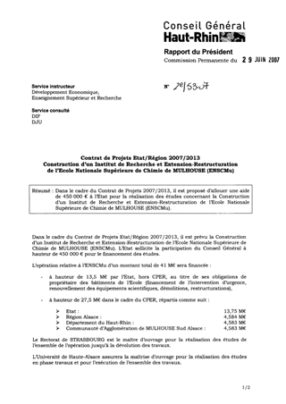 Dans le cadre du Contrat de Projets 2007/2013, il est proposé d’allouer une aide de 450 000 € à l’Etat pour la réalisation des études concernant la Construction d’un Institut de Recherche et Extension-Restructuration de l’Ecole Nationale Supérieure de Chimie de MULHOUSE (ENSCMu).