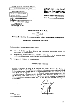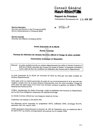 Forêt domaniale de la Harth. Percée centrale. Travaux de réfection du chemin forestier affecté à l'usage de piste cyclable. Convention technique et financière