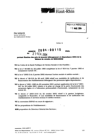 portant fixation des prix de journée hébergement et dépendance 2004 de la maison de retraite de Bergheim. Resumé Pièces jointes ARRETE Assemblée : Non défini Date : 27/02/2004 Rapporteur : Non défini Collectivité : Conseil départemental du Haut-Rhin Direction : Non défini Service : Service de la Tarification des Etablissements Domaine : Prix de Journée Commission :