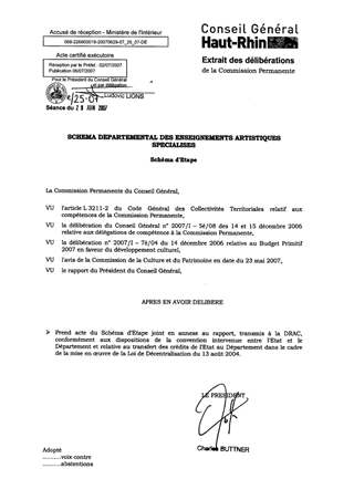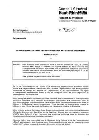 Dans le cadre d'une convention entre le Conseil Général et l'Etat, le Conseil Général s'est engagé à adresser un rapport d'étape du futur Schéma des Enseignements Artistiques Spécialisés, afin de permettre à l'Etat de préparer le transfert des crédits au Département, selon les modalités prévues par la Loi de Décentralisation du 13 août 2004. Il est proposé de prendre acte de ce document.