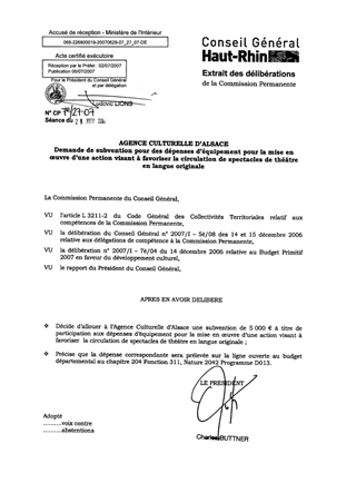 Agence Culturelle d'Alsace. Demande de subvention pour des dépenses d'équipement à réaliser pour la mise en oeuvre d'une action visant à favoriser la circulation de spectacles de théâtre en langue originale