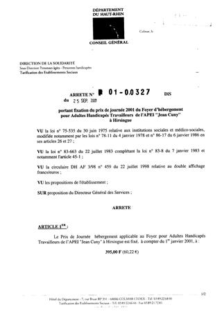 Portant fixation du prix de journée 2001 du Foyer d'hébergement pour Adultes handicapés travailleurs de l'APEI Jean Cuny à Hirsingue Resumé Pièces jointes ARRETE Assemblée : Non défini Date : 25/09/2001 Rapporteur : Non défini Collectivité : Conseil départemental du Haut-Rhin Direction : Non défini Service : Service de la Tarification des Etablissements Domaine : Prix de Journée Commission :