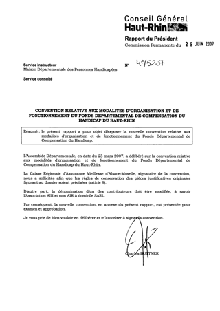 Convention relative aux modalités d'organisation et de fonctionnement du fonds départemental de compensation du handicap du Haut-Rhin