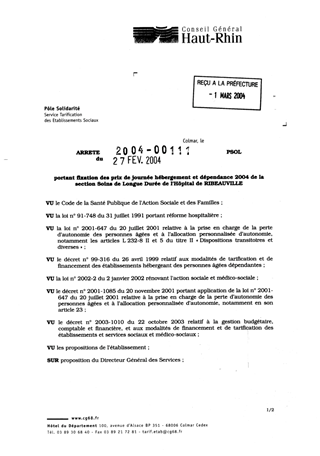 portant fixation des prix de journée hébergement et dépendance 2004 de la section soins de longue durée de l'hôpital de Ribeauvillé. Resumé Pièces jointes ARRETE Assemblée : Non défini Date : 27/02/2004 Rapporteur : Non défini Collectivité : Conseil départemental du Haut-Rhin Direction : Non défini Service : Service de la Tarification des Etablissements Domaine : Prix de Journée Commission :