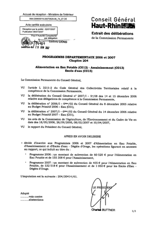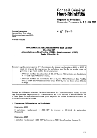 Après examen par la 6ème Commission des dossiers présentés en 2006 et 2007, il vous est proposé de programmer les opérations dont l'ordre de service nous est parvenu, ce qui induit au titre des programmes : - 2006 : un montant de subvention de 60 520 € pour l’Alimentation en Eau Potable et 155 308 € pour l'Assainissement, - 2007 : un montant de subventions de 455 € pour l’Alimentation en Eau Potable, de 532 518 € pour l'Assainissement et de 1 050 € pour les Excès d'eau (Dégâts d'Orage).