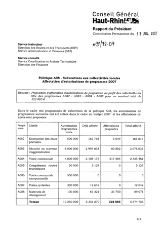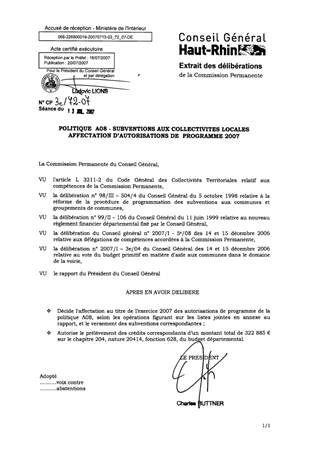 Politique A 08. Subventions aux collectivités locales. Affectation d'autorisation de programme 2007