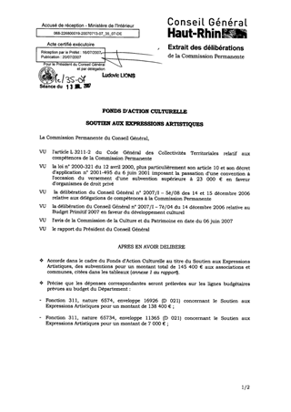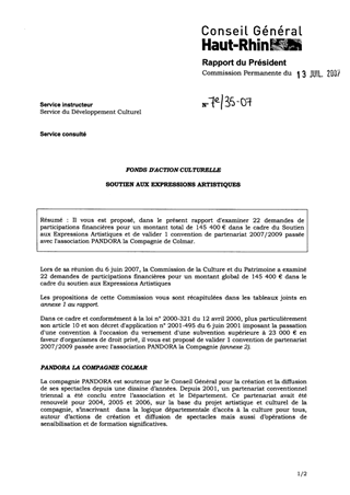 Il vous est proposé, dans le présent rapport d'examiner 22 demandes de participations financières pour un montant total de 145 400 € dans le cadre du Soutien aux Expressions Artistiques et de valider 1 convention de partenariat 2007/2009 passée avec l'association PANDORA la Compagnie de Colmar.