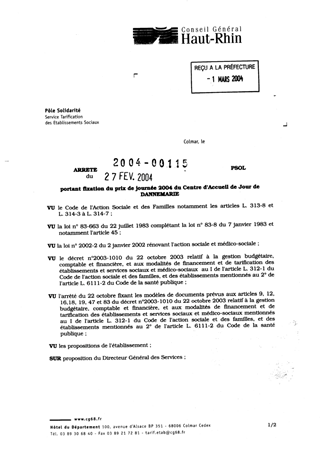portant fixation du prix de journée 2004 du centre d'accueil de jour de Dannemarie. Resumé Pièces jointes ARRETE Assemblée : Non défini Date : 27/02/2004 Rapporteur : Non défini Collectivité : Conseil départemental du Haut-Rhin Direction : Non défini Service : Service de la Tarification des Etablissements Domaine : Prix de Journée Commission :