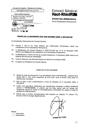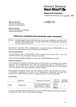 le présent rapport a pour objet d'autoriser la vente par adjudication volontaire d'une propriété départementale sise 4 rue des Bonnes Gens à MULHOUSE, moyennant une mise à prix de 520 000 €.