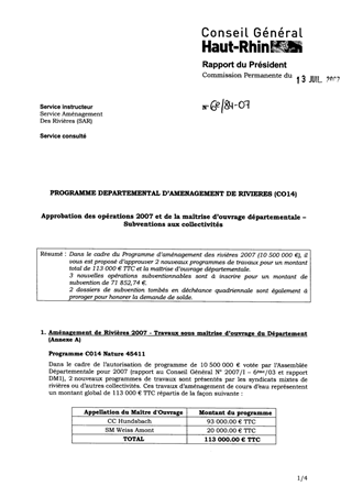 Programme départemental d'aménagement de rivières (C014) : approbation des opérations 2007 et de la maîtrise d'ouvrage départementale - Subventions aux collectivités