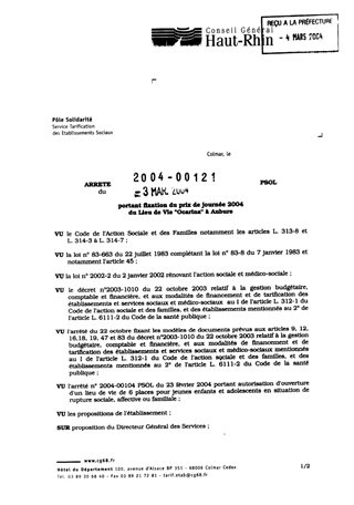 portant fixation du prix de journée 2004 du lieu de vie "Ocarina" à Aubure. Resumé Pièces jointes ARRETE Assemblée : Non défini Date : 03/03/2004 Rapporteur : Non défini Collectivité : Conseil départemental du Haut-Rhin Direction : Non défini Service : Service de la Tarification des Etablissements Domaine : Prix de Journée Commission :