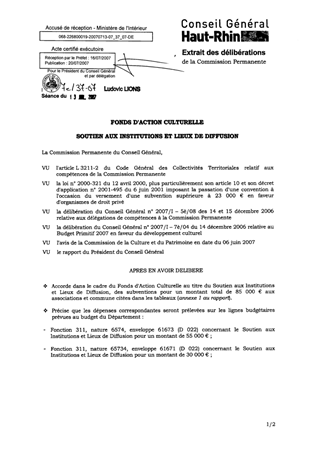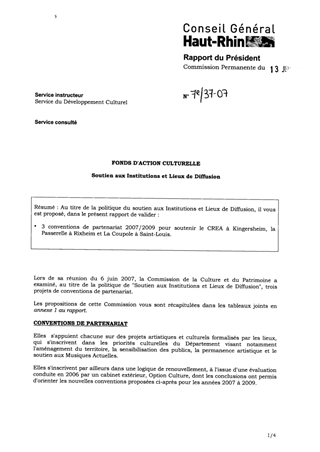 Au titre de la politique du soutien aux Institutions et Lieux de Diffusion, il vous est proposé, dans le présent rapport de valider 3 conventions de partenariat 2007/2009 pour soutenir le CREA à Kingersheim, la Passerelle à Rixheim et La Coupole à Saint-Louis.