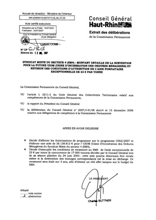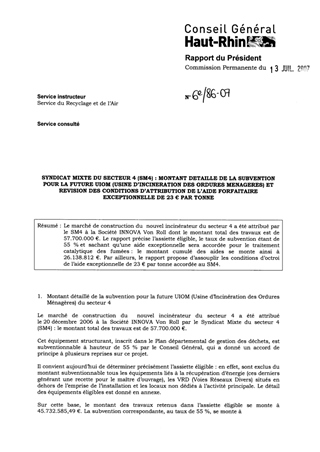 Le marché de construction du nouvel incinérateur du secteur 4 a été attribué par le SM4 à la Société INNOVA Von Roll dont le montant total des travaux est de 57.700.000 €. Le rapport précise l’assiette éligible, le taux de subvention étant de 55 % et sachant qu’une aide exceptionnelle sera accordée pour le traitement catalytique des fumées : le montant cumulé des aides se monte ainsi à 26.138.812 €. Par ailleurs, le rapport propose d’assouplir les conditions d’octroi de l’aide exceptionnelle de 23 € par tonne accordée au SM4.