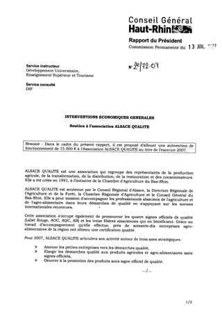 Dans le cadre du présent rapport, il est proposé d’allouer une subvention de fonctionnement de 15 000 € à l’Association ALSACE QUALITE au titre de l’exercice 2007