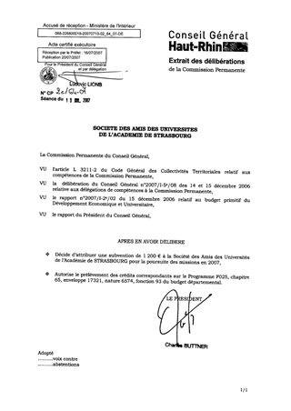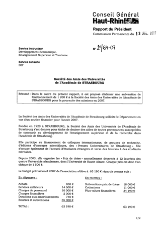 Dans le cadre du présent rapport, il est proposé d’allouer une subvention de fonctionnement de 1 200 € à la Société des Amis des Universités de l’Académie de STRASBOURG pour la poursuite des missions en 2007.