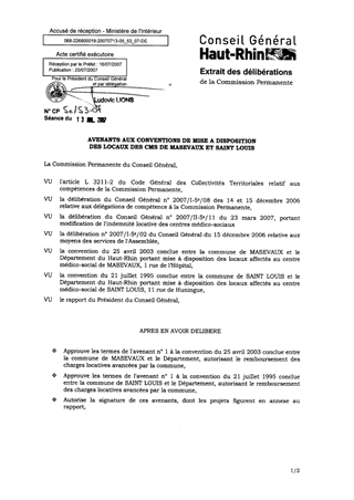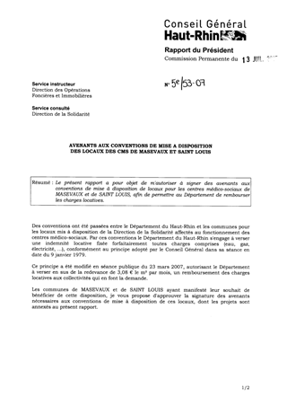 Le présent rapport a pour objet de m'autoriser à signer des avenants aux conventions de mise à disposition de locaux pour les centres médico-sociaux de MASEVAUX et de SAINT LOUIS, afin de permettre au Département de rembourser les charges locatives.