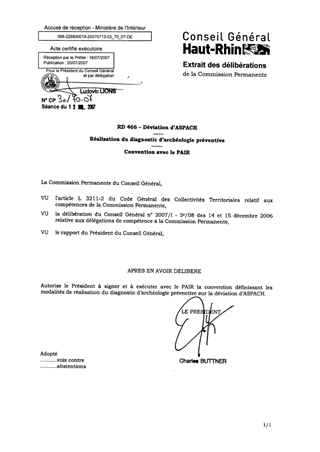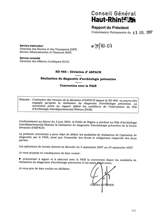 L’exécution des travaux de la déviation d’ASPACH depuis la RD 466 ne pourra être engagée qu’après la réalisation du diagnostic d’archéologie préventive. La convention jointe au rapport définit les conditions de l’intervention du Pôle d’Archéologie Interdépartemental Rhénan (PAIR).