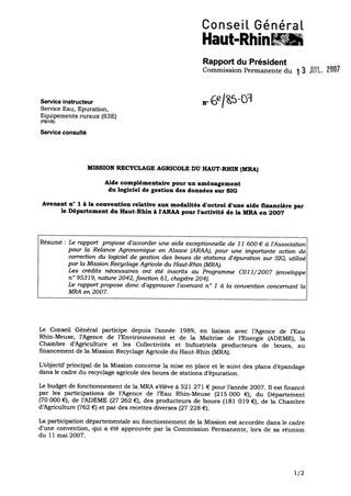 Le rapport propose d'accorder une aide exceptionnelle de 11 600 € à l'Association pour la Relance Agronomique en Alsace (ARAA), pour une importante action de correction du logiciel de gestion des boues de stations d'épuration sur SIG, utilisé par la Mission Recyclage Agricole du Haut-Rhin (MRA). Les crédits nécessaires ont été inscrits au Programme C011/2007 (enveloppe n° 95319, nature 2042, fonction 61, chapitre 204). Le rapport propose donc d'approuver l'avenant n° 1 à la convention concernant la MRA en 2007.