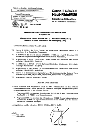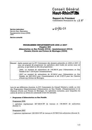 Programmes départementaux 2006 - 2007 : chapitre 204 - Alimentation en Eau Potable (C012) - Assainissement (C013) Chemin d'accès aux Fermes de Montagne (C044)