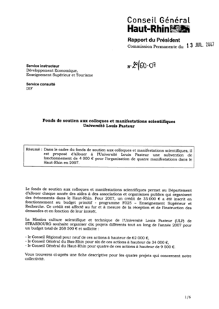 Dans le cadre du fonds de soutien aux colloques et manifestations scientifiques, il est proposé d’allouer à l’Université Louis Pasteur une subvention de fonctionnement de 4 000 € pour l’organisation de quatre manifestations dans le Haut-Rhin en 2007.
