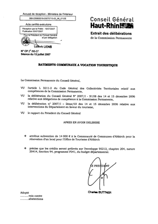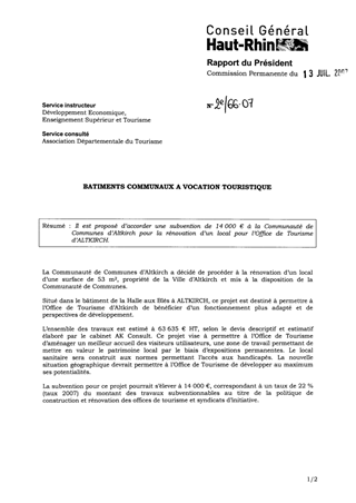 Il est proposé d’accorder une subvention de 14 000 € à la Communauté de Communes d’Altkirch pour la rénovation d’un local pour l’Office de Tourisme d’ALTKIRCH