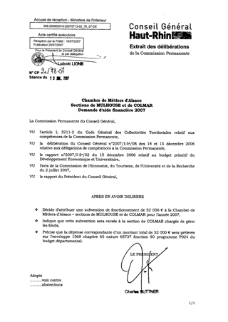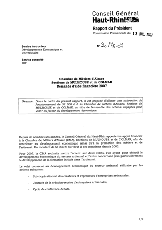 Dans le cadre du présent rapport, il est proposé d’allouer une subvention de fonctionnement de 52 000 € à la Chambre de Métiers d'Alsace, Sections de MULHOUSE et de COLMAR, au titre de l'ensemble des actions engagées pour 2007 en faveur du développement économique.