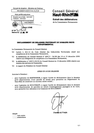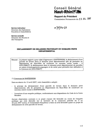 Le présent rapport a pour objet d'approuver à BARTENHEIM, le déclassement d'une parcelle de terrain dans le domaine privé départemental afin de permettre au Département du Haut-Rhin de construire un nouveau centre routier ; à SOULTZMATT, le déclassement dans le domaine privé départemental de parcelles en nature d'aménagements paysagers et de voirie, pour permettre leur aliénation à la Commune de SOULTZMATT.