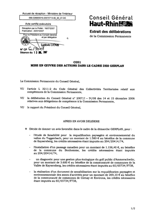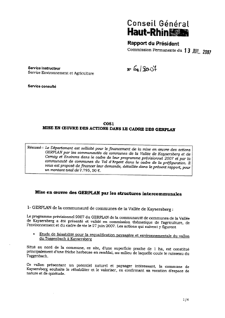 Le Département est sollicité pour le financement de la mise en œuvre des actions GERPLAN par les communautés de communes de la Vallée de Kaysersberg et de Cernay et Environs dans le cadre de leur programme prévisionnel 2007 et par la communauté de communes du Val d’Argent dans le cadre de la préfiguration. Il vous est proposé de financer leur demande, détaillée dans le présent rapport, pour un montant total de 7.795, 50 €.