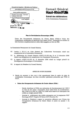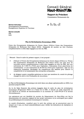 Dans le cadre du présent rapport, il est proposé :  d’allouer à l’Union des Groupements Artisanaux du Centre Alsace (UGA) et à l’Union des Corporations Artisanales de Mulhouse Sud Alsace (UCA) une aide pour de nouvelles actions complémentaires à celles déjà engagées au titre du PRE, soit une subvention de 4 000 € à l’UGA pour l’opération « Conception d’une plate forme de numérisation» et une subvention de 26 045 € à l’UCA pour l’opération « Agir sur les ressources humaines, développer les compétences des salariés pour assurer la compétitivité et la transmission des entreprises artisanales»,  de désigner quatre conseillers généraux en tant que membres du comité de pilotage chargés du suivi et de l’évaluation de ces actions.