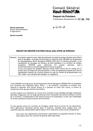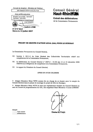 Le présent rapport a pour objet de présenter le projet de groupe d’action local (GAL) pour le Sundgau. Ce projet s’inscrit dans le cadre de l’axe LEADER du Programme de Développement Rural Hexagonal (PDRH) 2007-2013 et devrait permettre, si la candidature du Sundgau est retenue, de faire bénéficier à ce territoire de crédits européens FEADER pour cofinancer les projets agricoles, agro-environnementaux et de développement rural de ce secteur. Il vous est proposé de désigner Monsieur Rémy WITH comme élu en charge de ce dossier pour le compte du Conseil Général. Il vous est également proposé qu’il soit le représentant titulaire du Conseil Général au sein du comité de programmation du GAL. Enfin, vous voudrez bien désigner un suppléant.