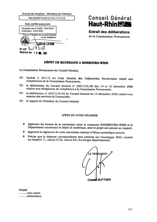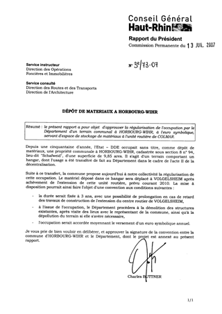 Le présent rapport a pour objet d'approuver la régularisation de l'occupation par le Département d'un terrain communal à HORBOURG-WIHR, à l'euro symbolique, servant d'espace de stockage de matériaux à l'unité routière de COLMAR.