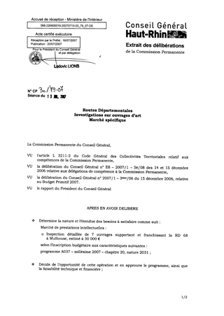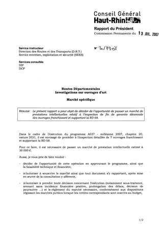 Le présent rapport a pour objet de décider de l’opportunité de passer un marché de prestations intellectuelles relatif à l’inspection de fin de garantie décennale des ouvrages franchissant et supportant la RD 68.