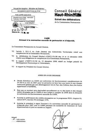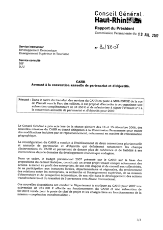 Dans le cadre du transfert des services du CAHR en poste à MULHOUSE de la rue de Pfastatt vers le Parc des collines, il est proposé d’accorder à cet organisme une subvention complémentaire de 34 350 € et de m’autoriser à signer l’avenant n°1 à la convention annuelle de partenariat et d’objectifs pour 2007.