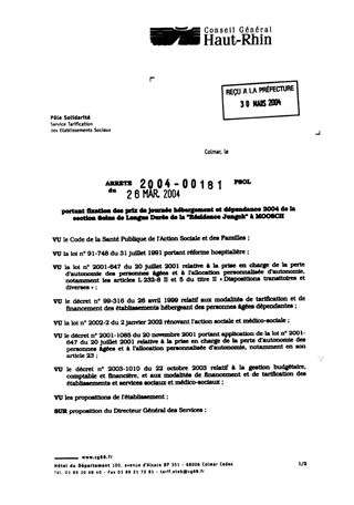 Portant fixation des prix de journée hébergement et dépendance 2004 de la section Soins de Longue Durée de la Résidence Jungck à MOOSCH Resumé Pièces jointes ARRETE Assemblée : Non défini Date : 26/03/2004 Rapporteur : Non défini Collectivité : Conseil départemental du Haut-Rhin Direction : Non défini Service : Service de la Tarification des Etablissements Domaine : Prix de Journée Commission :