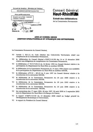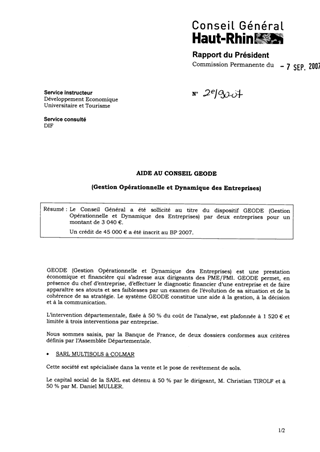 Le Conseil Général a été sollicité au titre du dispositif GEODE (Gestion Opérationnelle et Dynamique des Entreprises) par deux entreprises pour un montant de 3 040 €. Un crédit de 45 000 € a été inscrit au BP 2007.