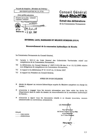 Dans le cadre du renouvellement de la concession hydraulique de Kembs, le Département souhaite que la redevance proportionnelle aux recettes résultant des ventes d’électricité, ainsi que les réserves en énergies soient fixées à leur maximum légal (loi du 16 octobre 1919, telle que modifiée par la loi de finances rectificative n° 2006-1771 du 30 décembre 2006). La demande faite au préfet de solliciter auprès d’EDF un nouveau cahier des charges plus favorable au Département n’ayant pas été satisfaite, et celui-ci rejetant l’argumentation avancée, le Département souhaite engager un recours hiérarchique auprès du Ministre compétent, en charge du dossier.