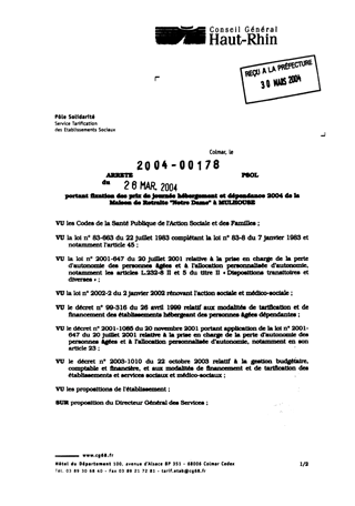 Portant fixation des prix de journée hébergemnet et dépendance 2004 de la Maison de retraite "Notre Dame" à MULHOUSE Resumé Pièces jointes ARRETE Assemblée : Non défini Date : 26/03/2004 Rapporteur : Non défini Collectivité : Conseil départemental du Haut-Rhin Direction : Non défini Service : Service de la Tarification des Etablissements Domaine : Prix de Journée Commission :