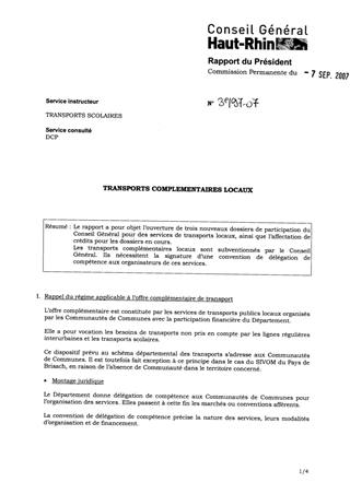 Le rapport a pour objet l’ouverture de trois nouveaux dossiers de participation du Conseil Général pour des services de transports locaux, ainsi que l’affectation de crédits pour les dossiers en cours. Les transports complémentaires locaux sont subventionnés par le Conseil Général. Ils nécessitent la signature d’une convention de délégation de compétence aux organisateurs de ces services.