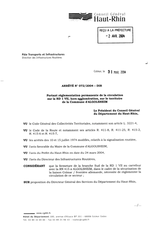 Portant réglementation permanente de la circulation sur la RD 1 VII, hors agglomération, sur le territoire de la Commune d'ALGOLSHEIM Resumé Pièces jointes ARRETE Assemblée : Non défini Date : 31/03/2004 Rapporteur : Non défini Collectivité : Conseil départemental du Haut-Rhin Direction : Non défini Service : Direction des Routes Domaine : Circulation Commission :