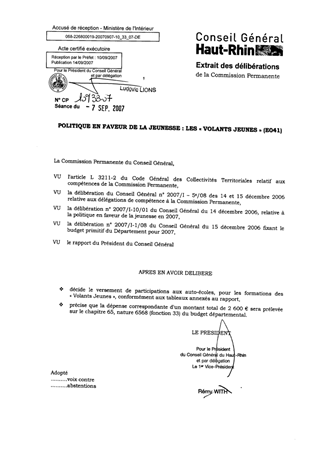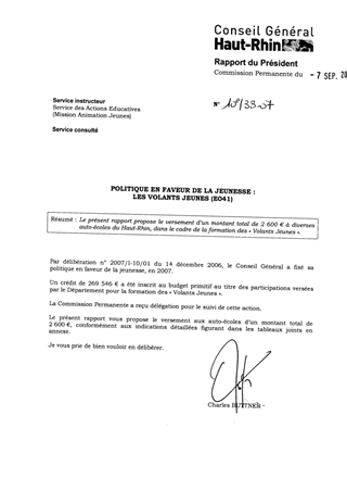 Le présent rapport propose le versement d’un montant total de 2 600 € à diverses auto-écoles du Haut-Rhin, dans le cadre de la formation des « Volants Jeunes ».