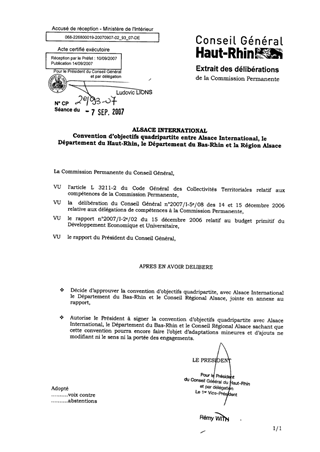 ll est proposé d’adopter une convention d’objectifs quadripartite entre Alsace International, le Département du Haut-Rhin, le Département du Bas-Rhin et la Région Alsace qui explicite les objectifs 2007 liés à l’action internationale (prospection et développement), les orientations stratégiques et la mise en place de la nouvelle organisation d’ALSACE INTERNATIONAL.