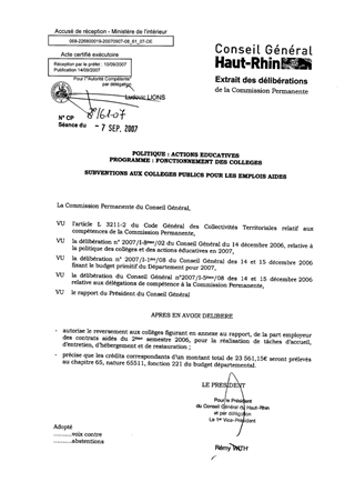 Politique : actions éducatives : programme fonctionnement des collèges Subventions aux collèges publics pour les emplois aidés