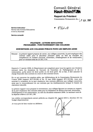 Le présent rapport propose de verser, aux collèges concernés, la part employeur des contrats aidés pour le deuxième semestre 2006, au titre du transfert de compétences en matière d’accueil, d’entretien, d’hébergement et de restauration, pour un montant total de 23 561,15 €.