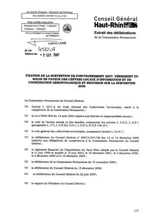 Fixation de la subvention de fonctionnement 2007 et versement du solde en faveur des centres locaux d'informationet de coordination gérontologique et provision sur la subvention 2008