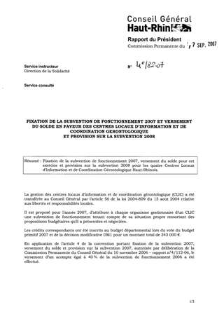 Fixation de la subvention de fonctionnement 2007, versement du solde pour cet exercice et provision sur la subvention 2008 pour les quatre Centres Locaux d’Information et de Coordination Gérontologique Haut-Rhinois.