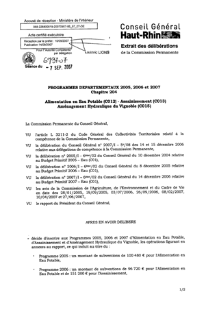 Programmes départementaux 2005,2006 et 2007 - Chapitre 204 - Alimentation en eau potable (C 012), Assainissement (C 013), Aménagement hydraulique du Vignoble (C 015)